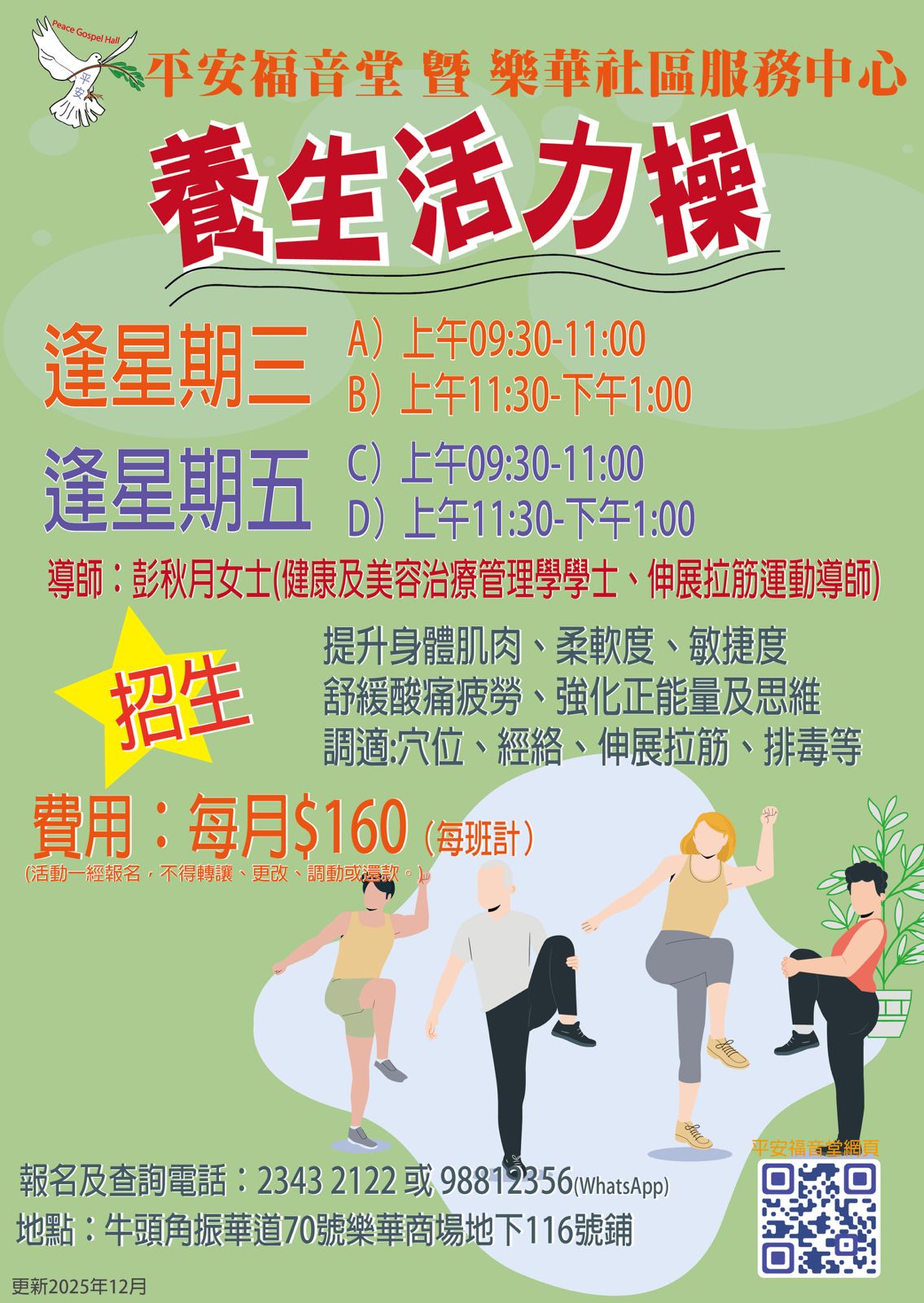由專業導師指導伸展拉筋運動,認識穴位、經絡、排毒等,透過群體互動學習,強身健體,提升身體肌肉柔軟度和敏捷感,舒緩酸痛疲勞,強化正能量和思維。
